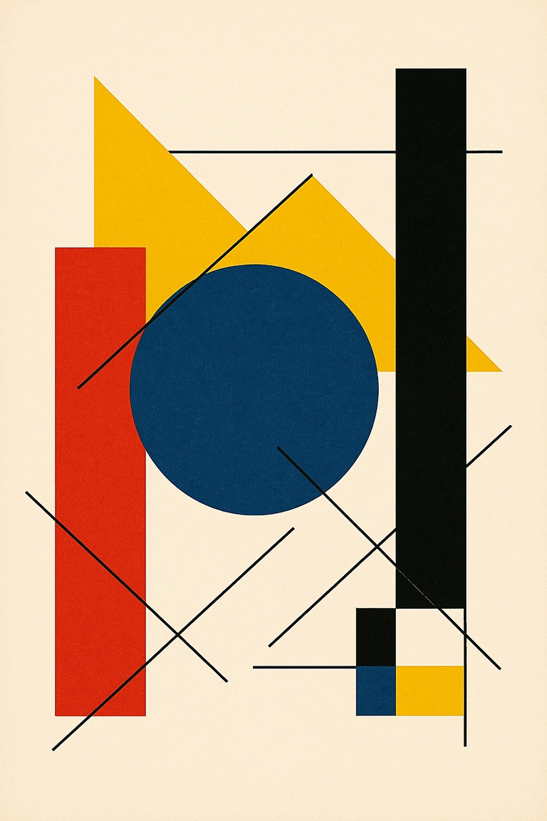 “Bauhaus design”, “geometric abstraction”, “primary color palette”, “minimalist poster art”, “modernist composition”, o “functional aesthetic”.