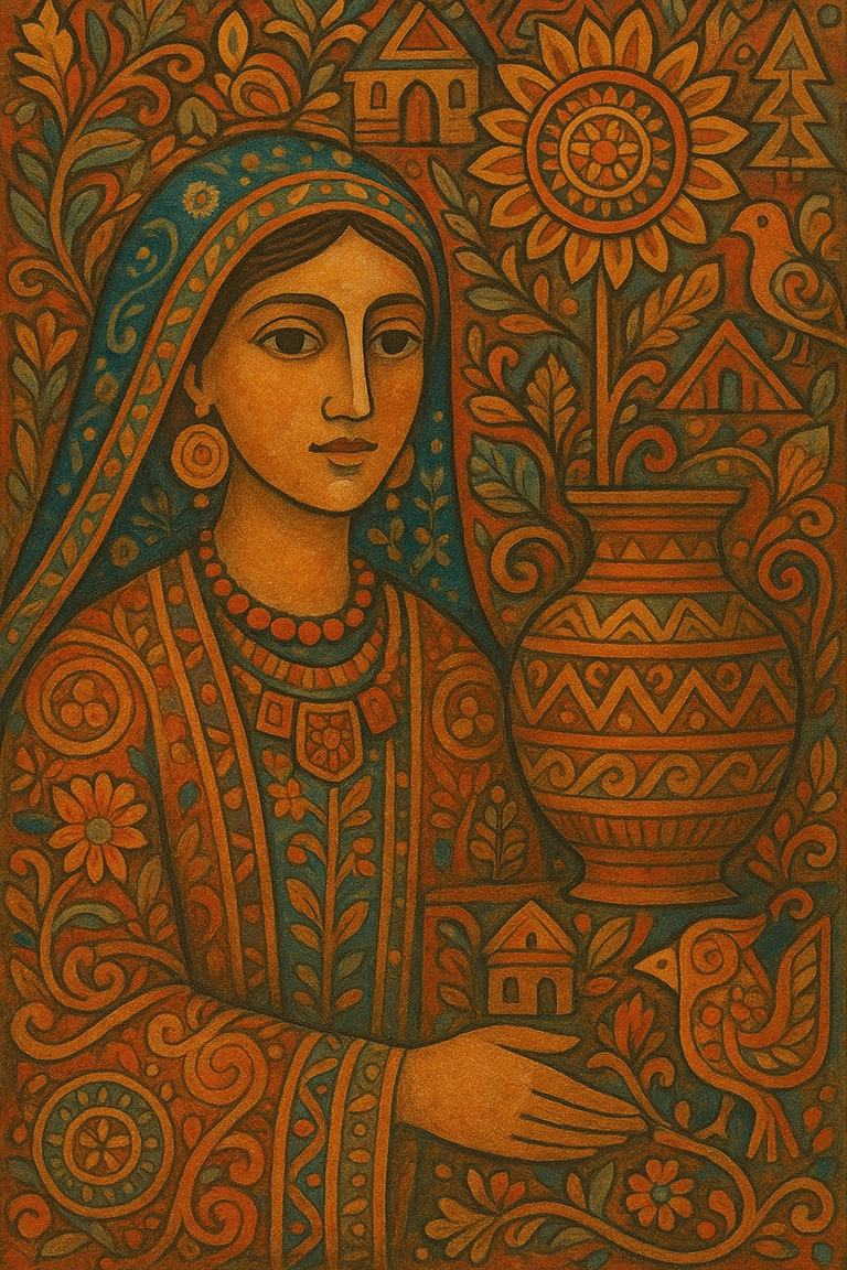 Para lograr coherencia, utiliza en los prompts términos como folk motifs, textile-inspired textures, ancestral patterns, ethnic art style o heritage symbolism. Trabaja con colores naturales y terrosos, como ocres, azules índigo o rojos minerales, y destaca la riqueza decorativa y artesanal de la composición.