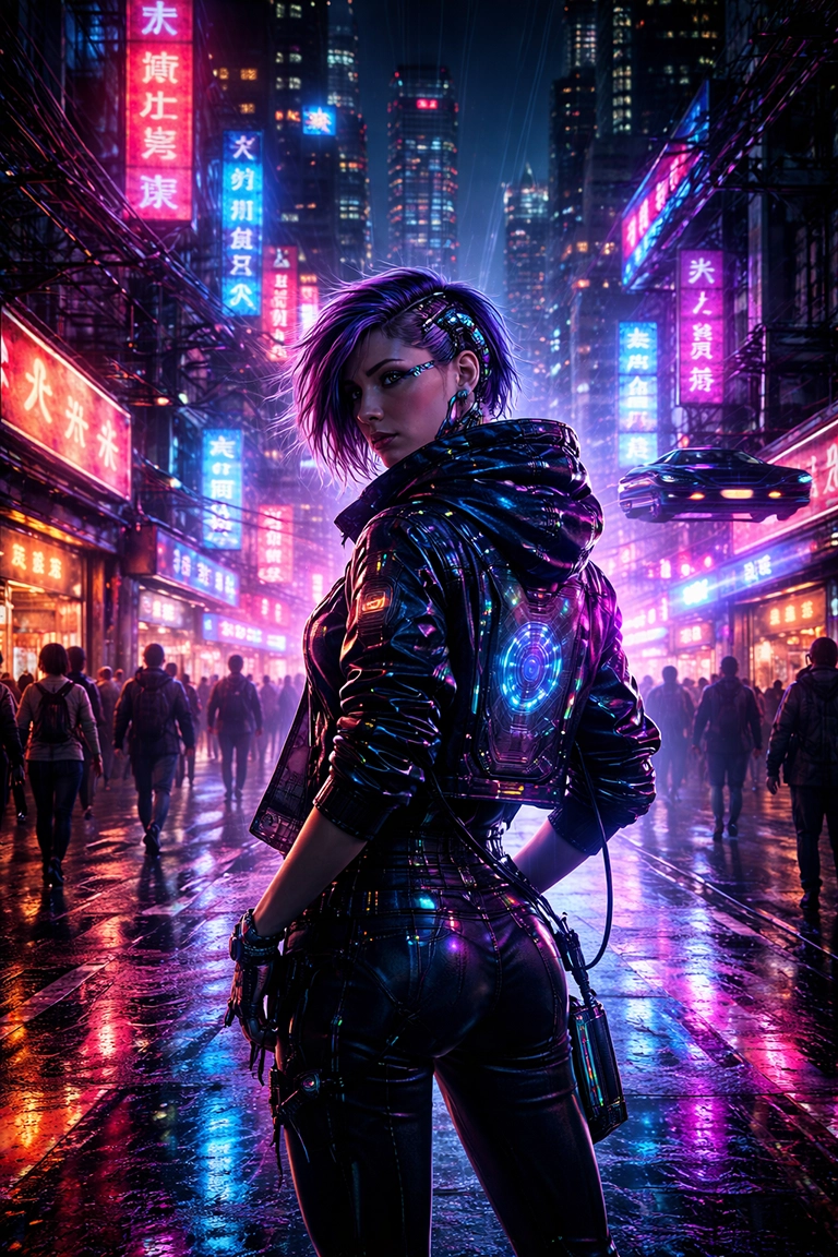 El estilo Cyberpunk es perfecto para proyectos de narrativa futurista, diseño de videojuegos, ilustraciones conceptuales o moda alternativa. Transmite energía, caos, peligro y belleza artificial. Al generar imágenes con IA, puedes usar términos como neon cityscape, futuristic dystopia, rain-soaked streets, neon reflections, cybernetic character o holographic light.