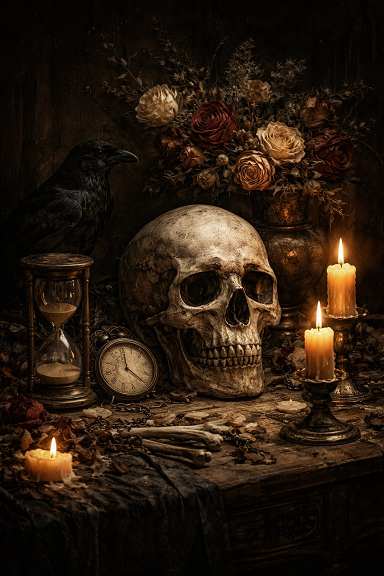 Para lograr coherencia, utiliza términos como vanitas art, memento mori, gothic symbolism, dark floral still life, baroque skull motif o ritual atmosphere. Juega con contrastes de luz cálida sobre fondo oscuro, incorporando objetos simbólicos: relojes de arena, velas o huesos estilizados.
