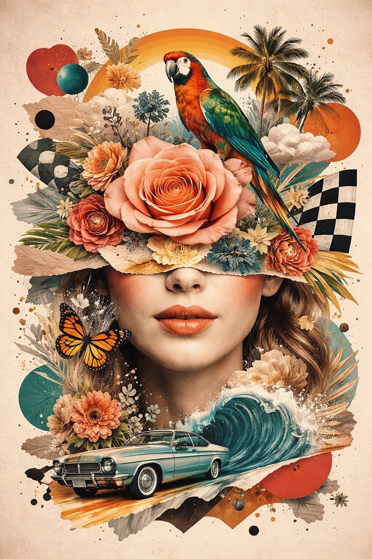 El estilo Digital Collage es ideal para proyectos editoriales, artísticos o conceptuales que buscan impacto visual. Funciona muy bien en portadas, carteles, branding experimental o arte narrativo. En prompts de IA, emplea términos como digital collage, surreal composition, cutout aesthetic, mixed media layers, photo montage o fragmented symbolism.