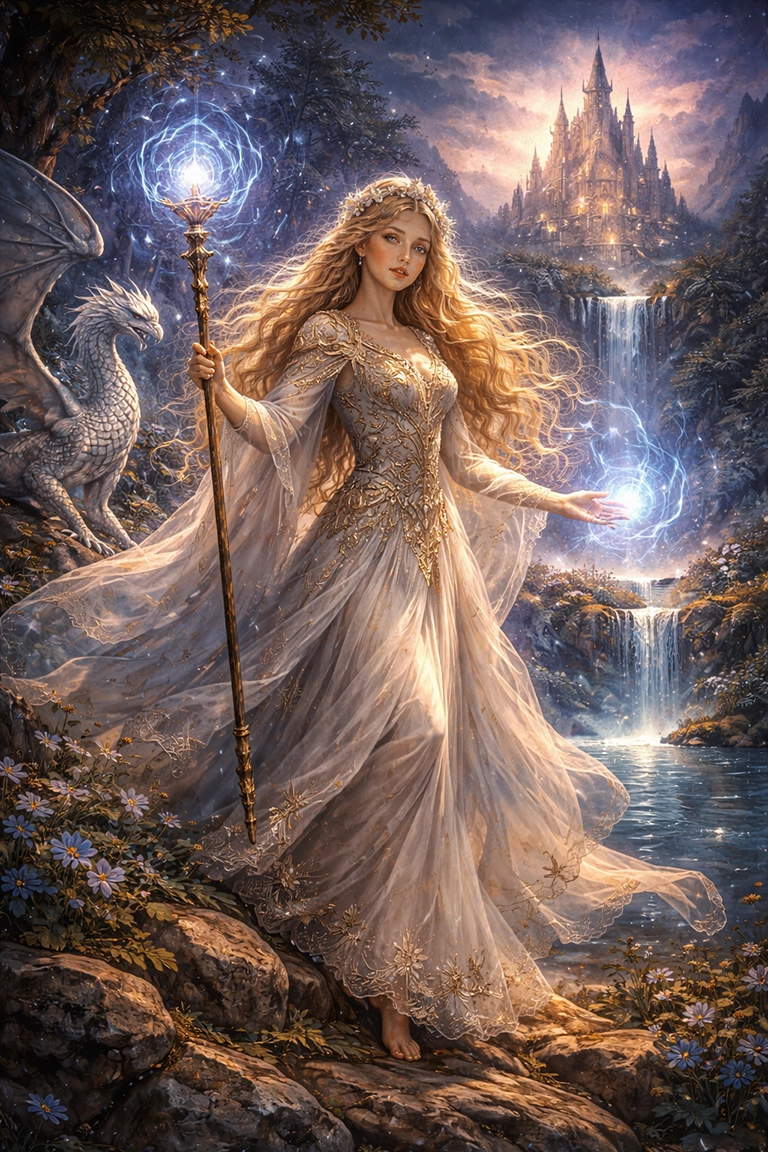 En tus prompts, combina términos como fantasy illustration, epic fantasy art, magical realism, detailed fantasy scene, mythical creature, storybook composition o digital painting fantasy style.