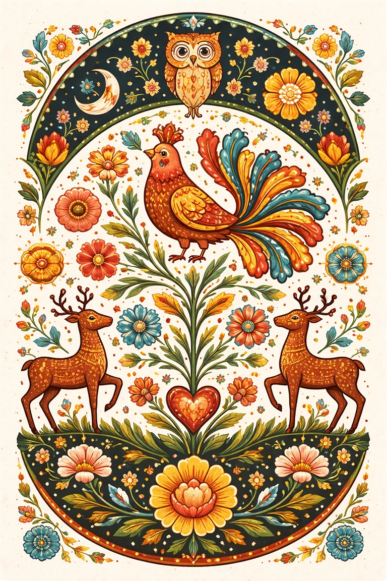En tus prompts, usa términos como folk art, traditional patterns, cultural symbolism, ethnic decorative style, folk motifs, handcrafted illustration o vibrant narrative composition.
