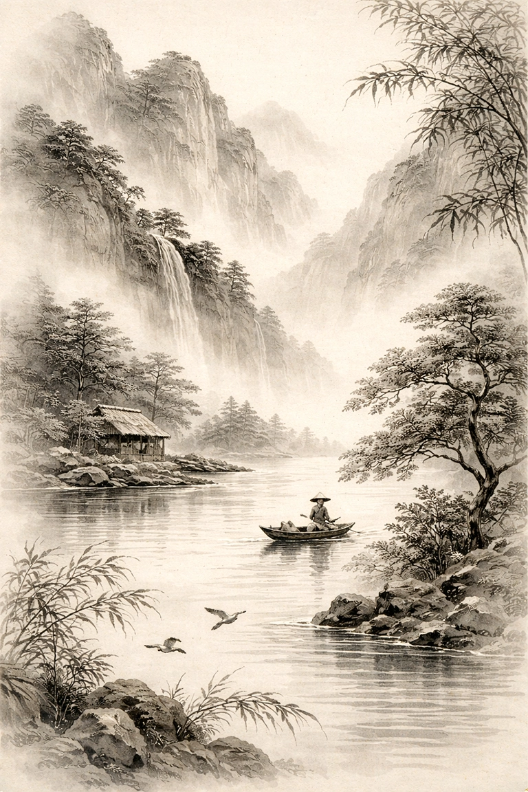 El estilo Ink Wash es ideal para proyectos artísticos, conceptuales o espirituales donde el equilibrio y la sutileza sean esenciales. En prompts de IA, utiliza términos como ink wash painting, sumi-e art, traditional Chinese brushwork, Japanese ink landscape, minimalist ink tones o water-based ink texture.