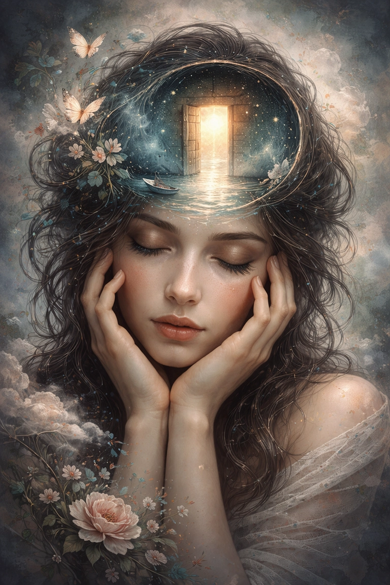 En IA, usa términos como inner world, psychological symbolism, dreamlike portrait, surreal emotion, subconscious imagery, soft diffusion, introspective lighting o emotional surrealism.
