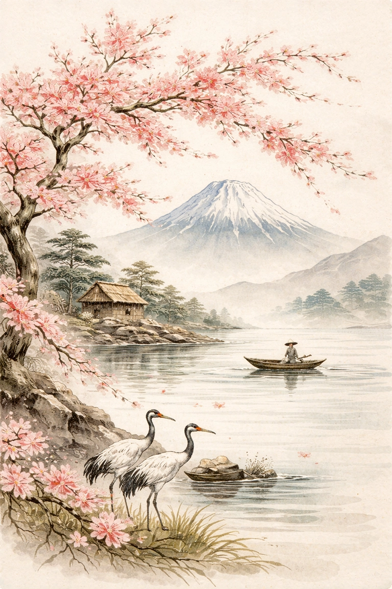 Para mantener coherencia, prioriza la simplicidad y el equilibrio del espacio. La IA puede recrear el trazo manual de tinta o pincel, combinando textura artesanal con claridad visual. Añadir elementos naturales (ramas, montañas, agua o grullas) y tonos suaves aporta autenticidad.
