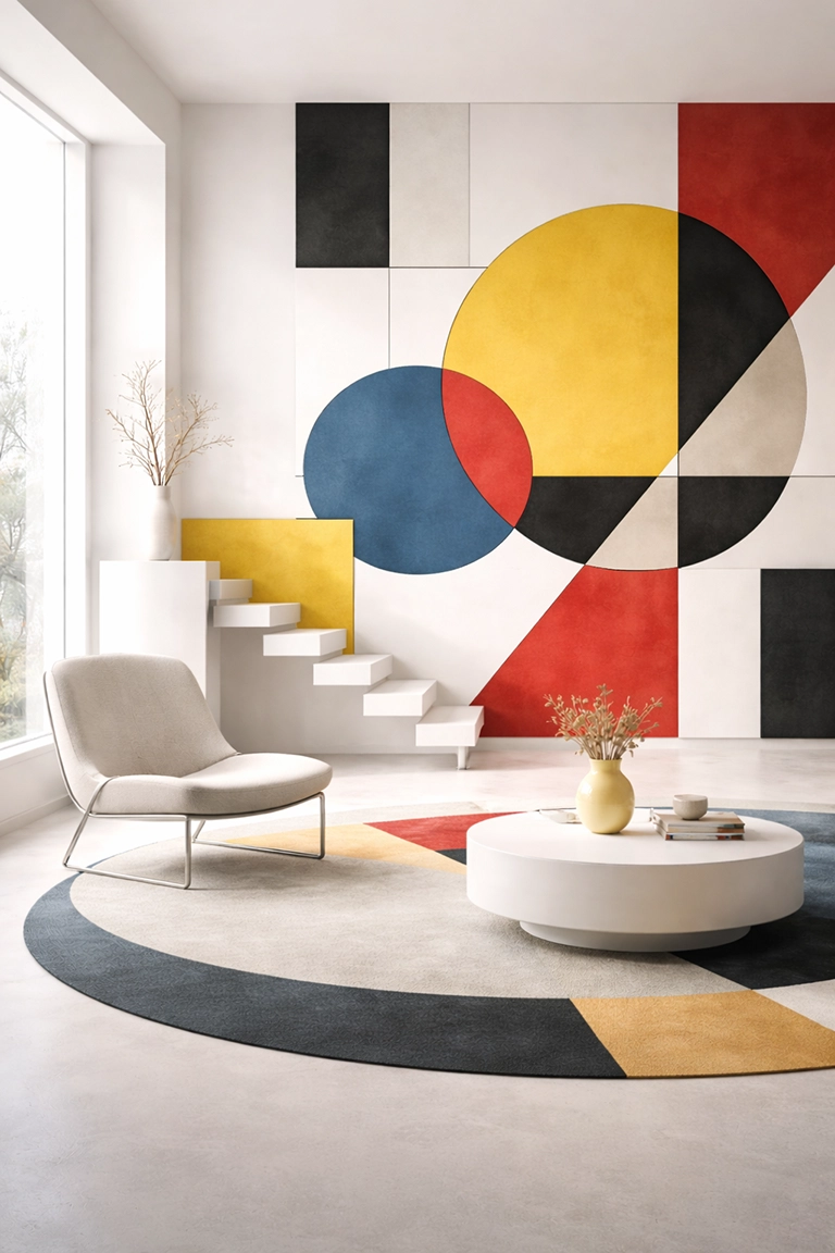 En IA, utiliza términos como modernism, Bauhaus influence, geometric abstraction, clean lines, functional design, primary colors, structural composition, o minimalist modern aesthetic.