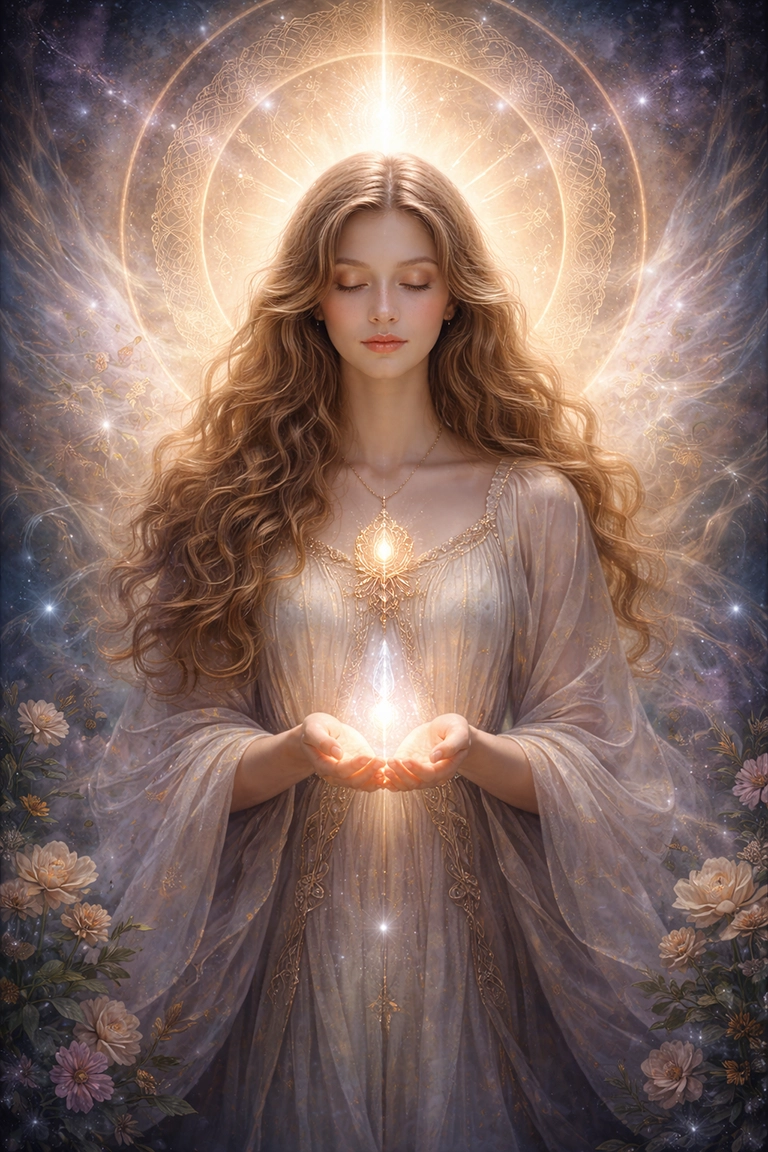 En IA, utiliza términos como mysticism, spiritual light, divine aura, sacred geometry, ethereal symbolism, transcendent art, cosmic energy, o mystical atmosphere.