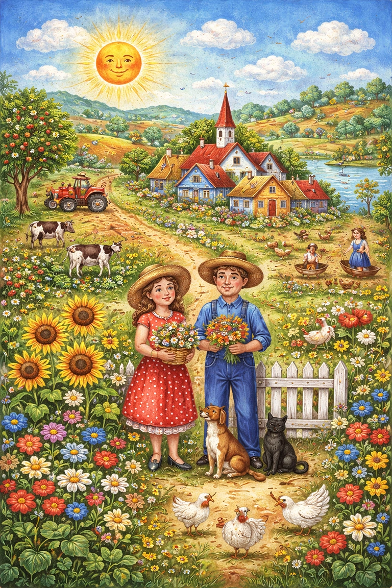 El estilo Naive Art funciona perfectamente en escenas folklóricas, retratos coloridos, ilustraciones infantiles o composiciones simbólicas.