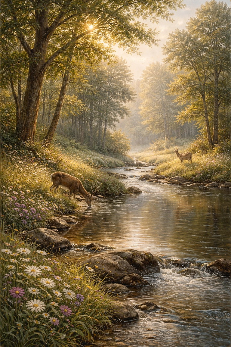 En IA, utiliza términos como nature scene, natural landscape, forest morning light, river reflection, soft sunlight, realistic foliage, organic composition o tranquil atmosphere.