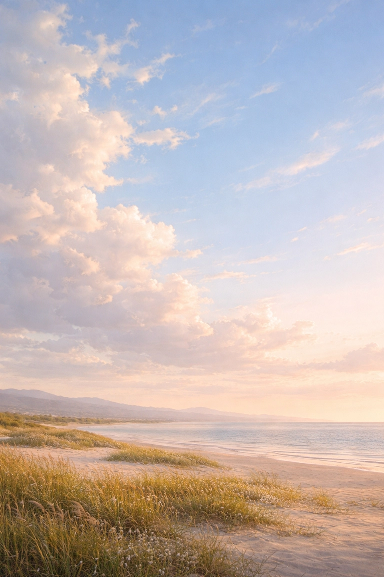 En IA, utiliza términos como open sky, wide horizon, minimalist landscape, soft light, aerial perspective, serene atmosphere, expansive view, o pastel sky gradient.