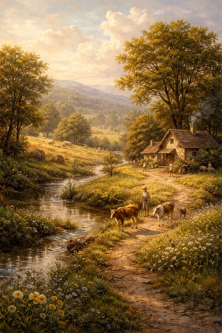 El estilo Pastoral Landscape es ideal para ilustraciones de ambientes naturales, paisajes clásicos o arte evocador. En prompts de IA, usa términos como pastoral landscape, golden fields, romantic countryside, soft sunlight, rolling hills, idyllic nature scene, fine art landscape painting, o 19th century realism.