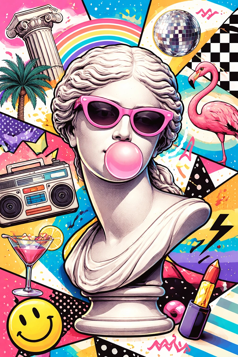 El estilo Postmodernism es ideal para proyectos visuales conceptuales, collages digitales o arte que desafíe la coherencia tradicional. En prompts de IA, usa términos como postmodern art, eclectic style, cultural collage, neo-classical irony, pop culture aesthetic, mixed media design, vaporwave influence, o retro-futuristic composition.