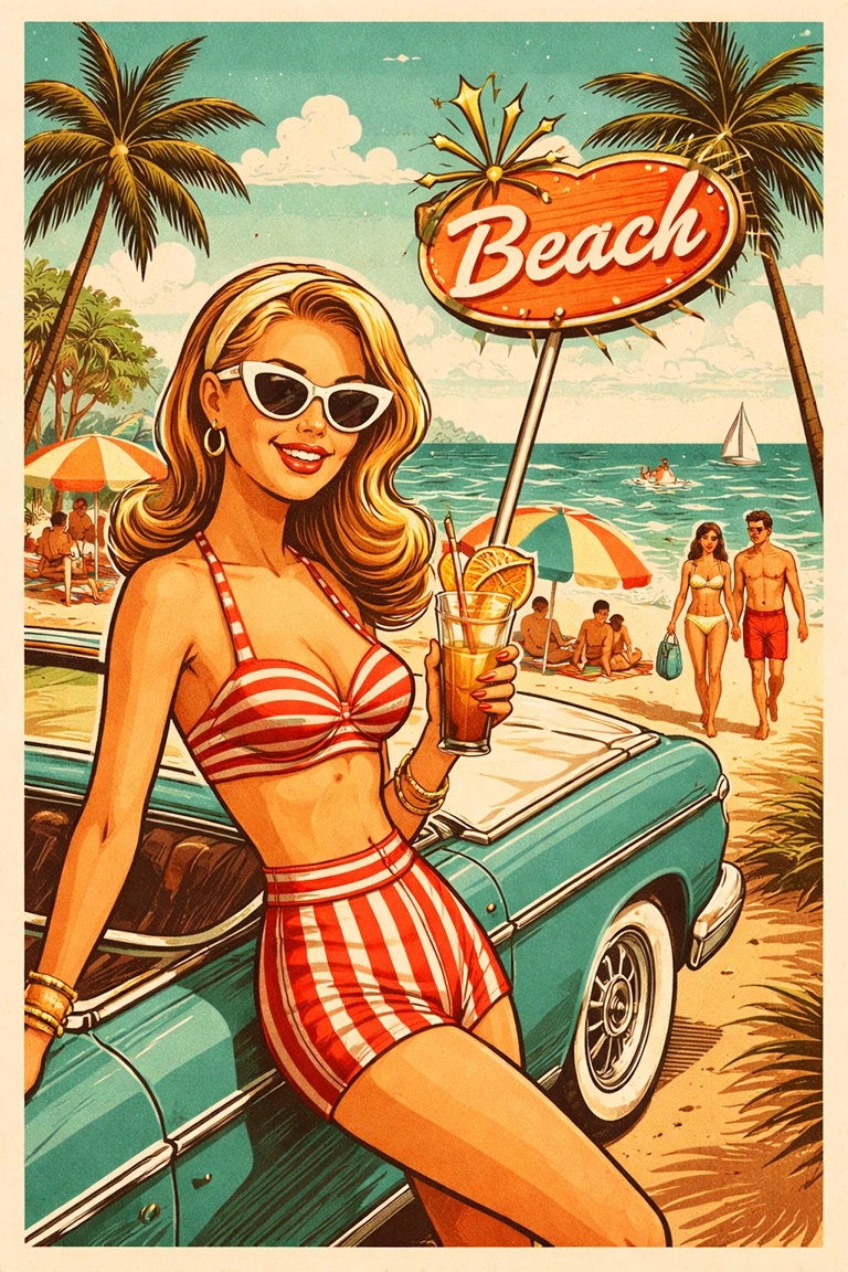 El estilo Retro es ideal para ilustraciones, carteles, branding artístico o retratos con estética nostálgica. En prompts de IA, usa términos como retro style, mid-century design, vintage illustration, 1950s color palette, old print texture, retro poster art, o nostalgic aesthetic.