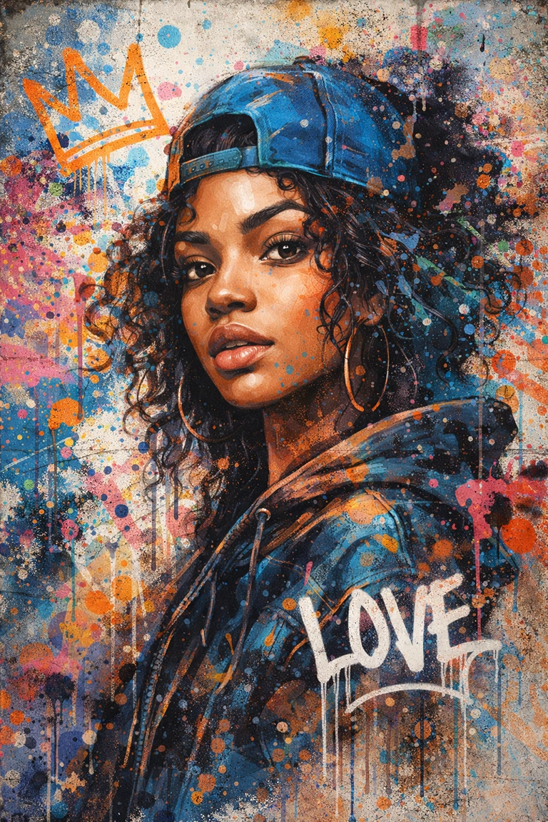 El estilo Urban Art es ideal para retratos contemporáneos, arte conceptual, carteles, portadas o fondos expresivos. En prompts de IA, funcionan muy bien términos como urban art, street art style, spray paint texture, graffiti wall, raw urban aesthetic, bold colors, layered paint, o city wall mural.