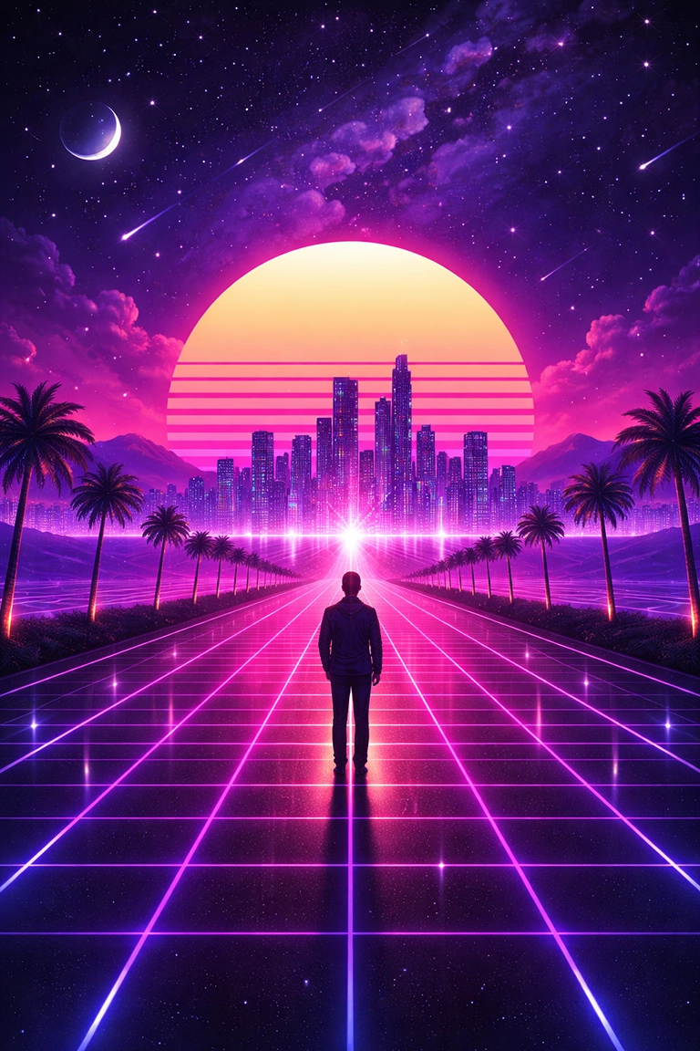 El Synthwave funciona perfectamente en paisajes urbanos, retratos estilizados y composiciones conceptuales con energía visual. En prompts de IA, usa términos como “synthwave style”, “80s retro futurism”, “neon lights”, “digital sunset”, “cyber grid landscape”, o “vaporwave atmosphere”.