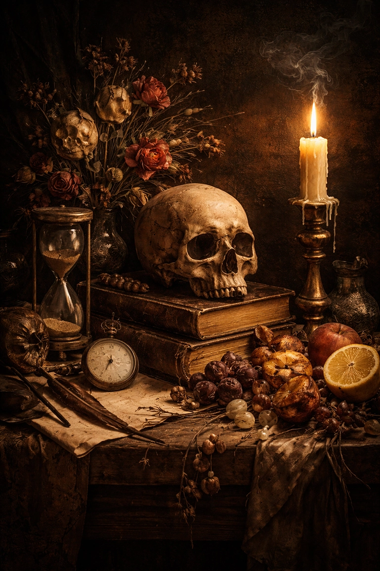 ✦ Objetos recurrentes: calaveras, relojes, flores secas, frutas, velas o libros.